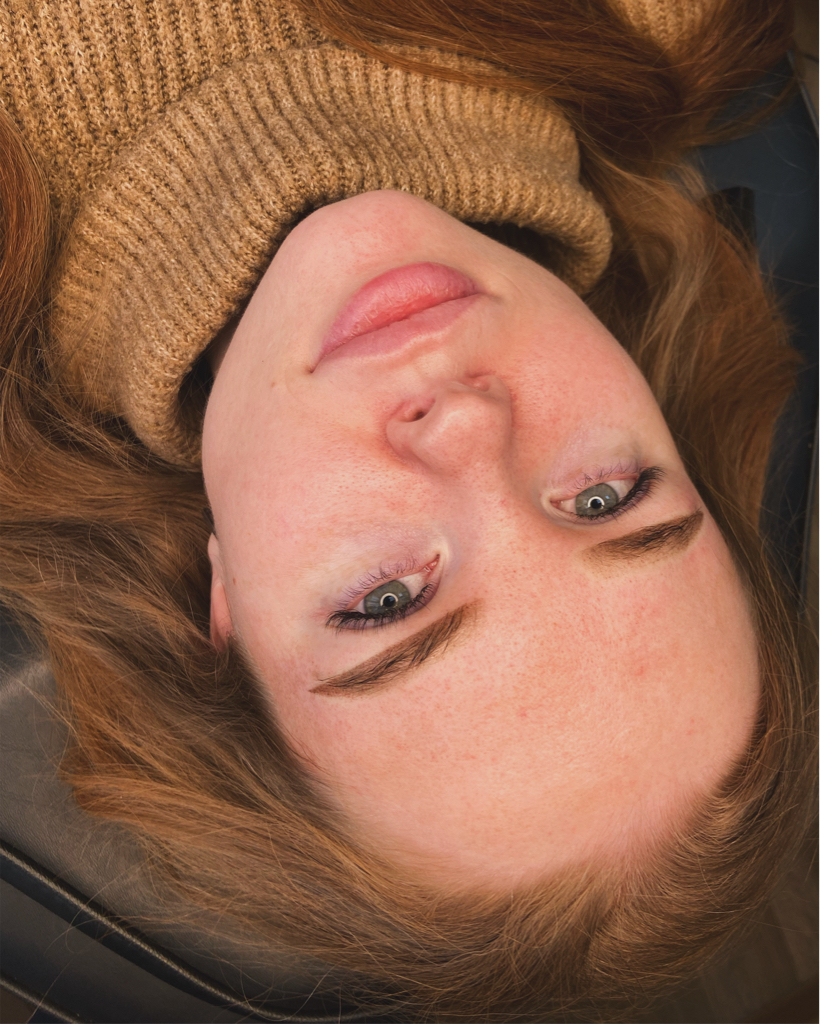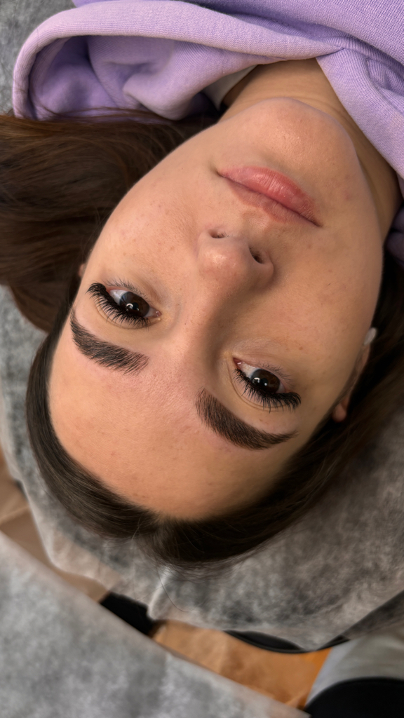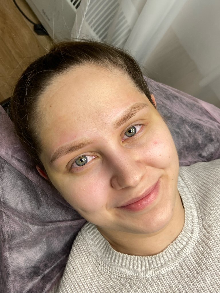 На сеансе отрисовывается форма бровей, выбираем оттенок пигмента. Пигмент имплантируется максимально поверхностно.