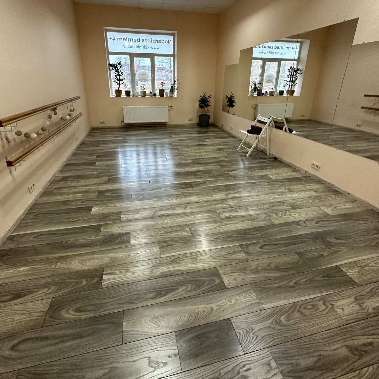 Zāle aprīkota ar spoguliem ir baleta stanga un mīkstie paklājiņi.
