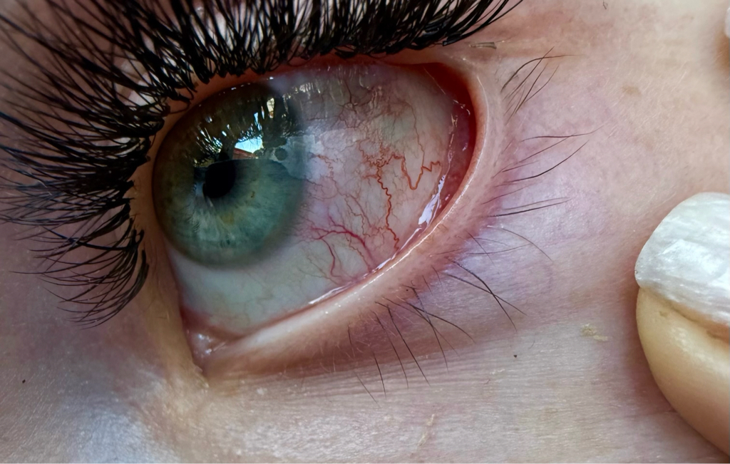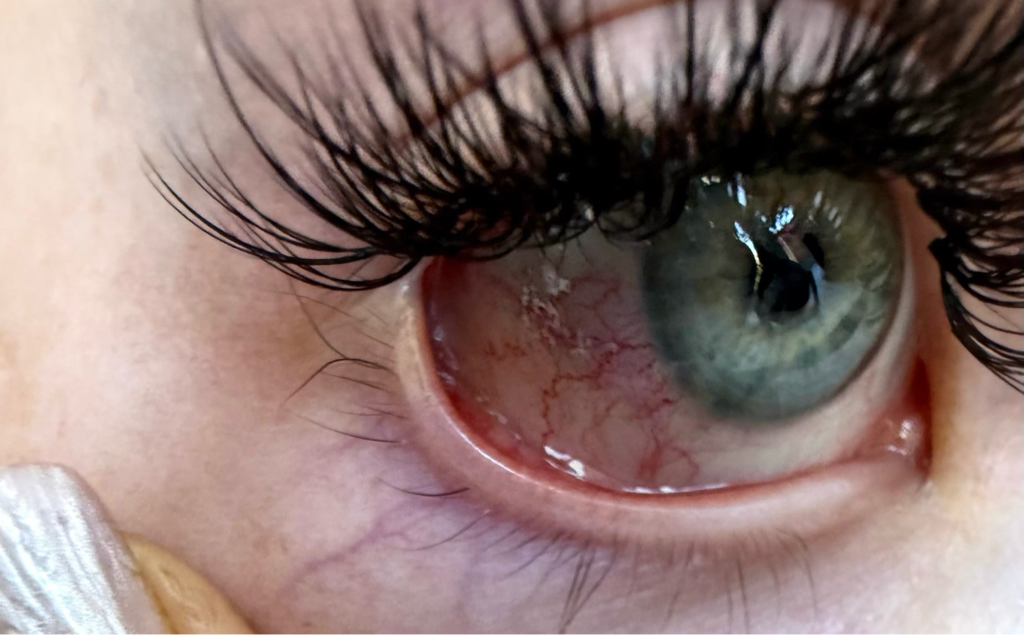 он слезился,я сообщила об этом мастеру.На следующее утро я поняла что у меня сильно болят глаза,больно моргать они мутные и красные в тот день был День Рождения,мастер сказала что ничего страшного само пройдет.К офтальмологу я сходила сегодня и это ожег роговицы глаза