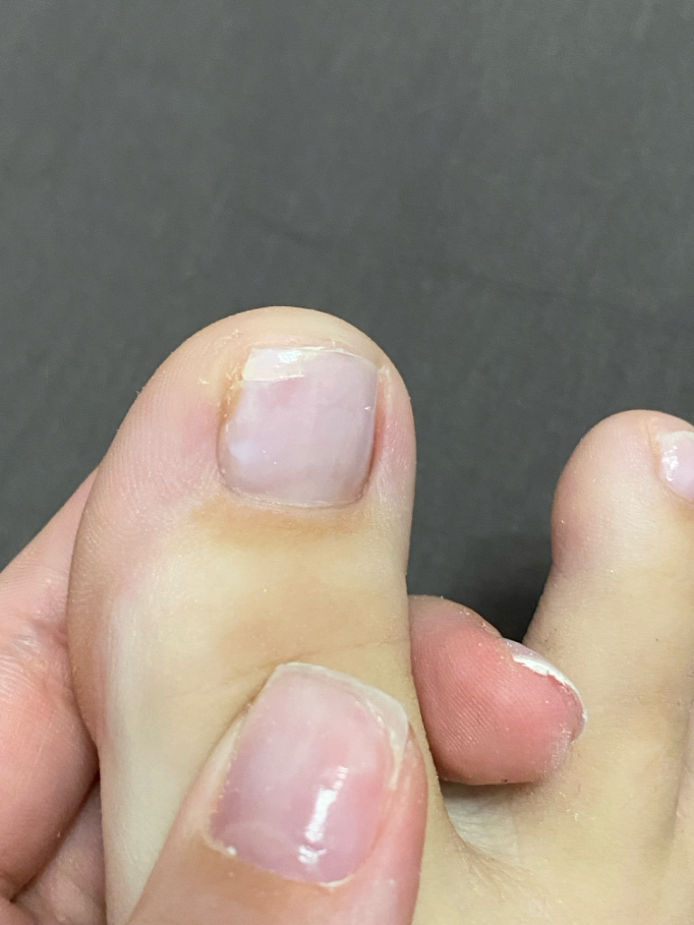 Вчера была на процедуре педикюра и маникюра в 4 руки. У данного мастера была на педикюре . Нужно было обработать только пальцы, снять гель-лак и покрыть обычным лаком. Перед процедурой я предупредила, что у меня есть трещина на ногте большого пальца. Относила гель я 3 недели. Кутикулу еще обработали, а вот все остальное,видимо, не нужно. Трещину покрыли очень тонким слоем геля.