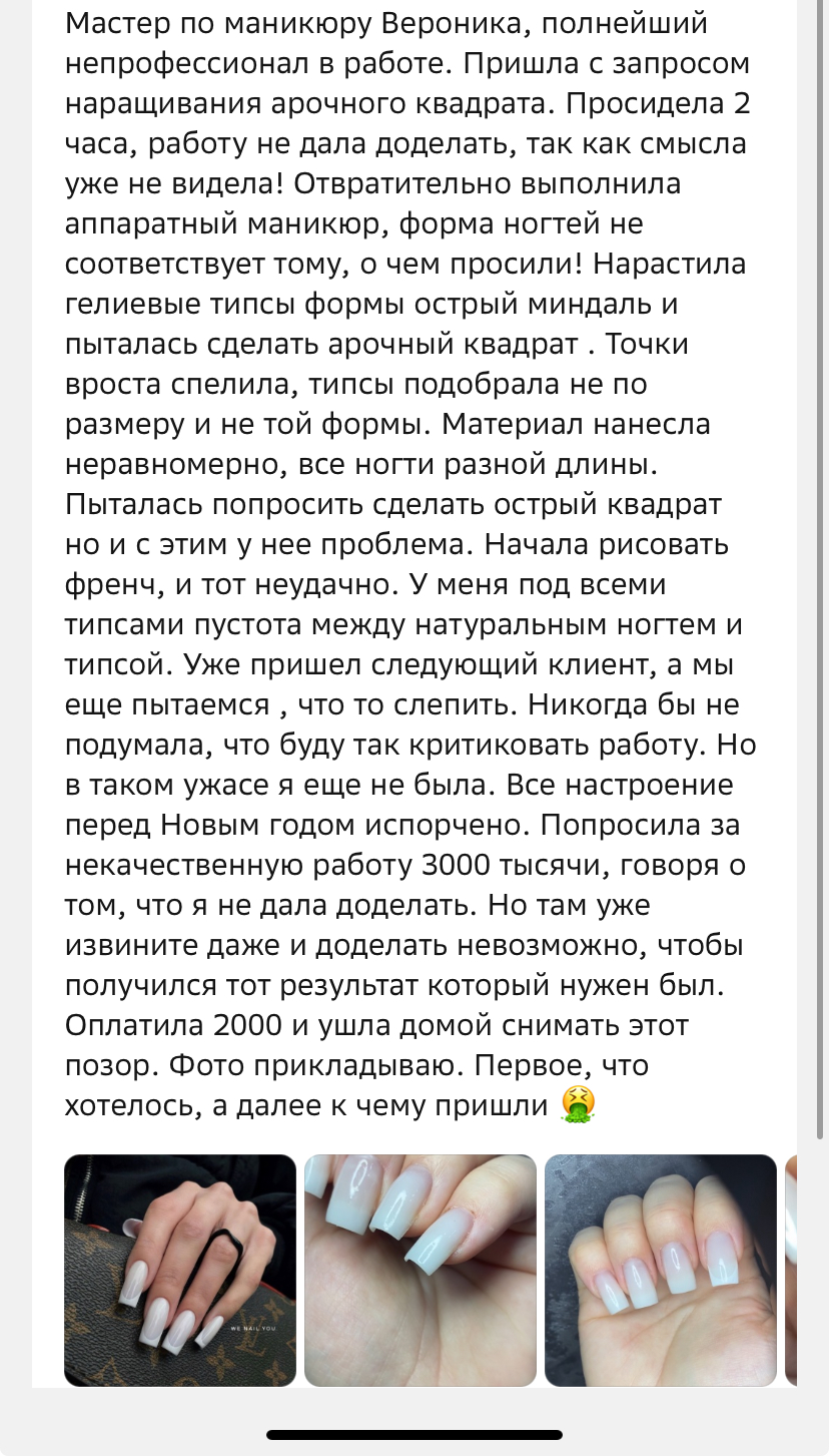 Мастер по маникюру Вероника, полнейший непрофессионал в работе. К сожалению все то, что было тут не дает описать поэтому приложила скрин. Там подробно все написано. НЕ СОВЕТУЮ СОВСЕМ